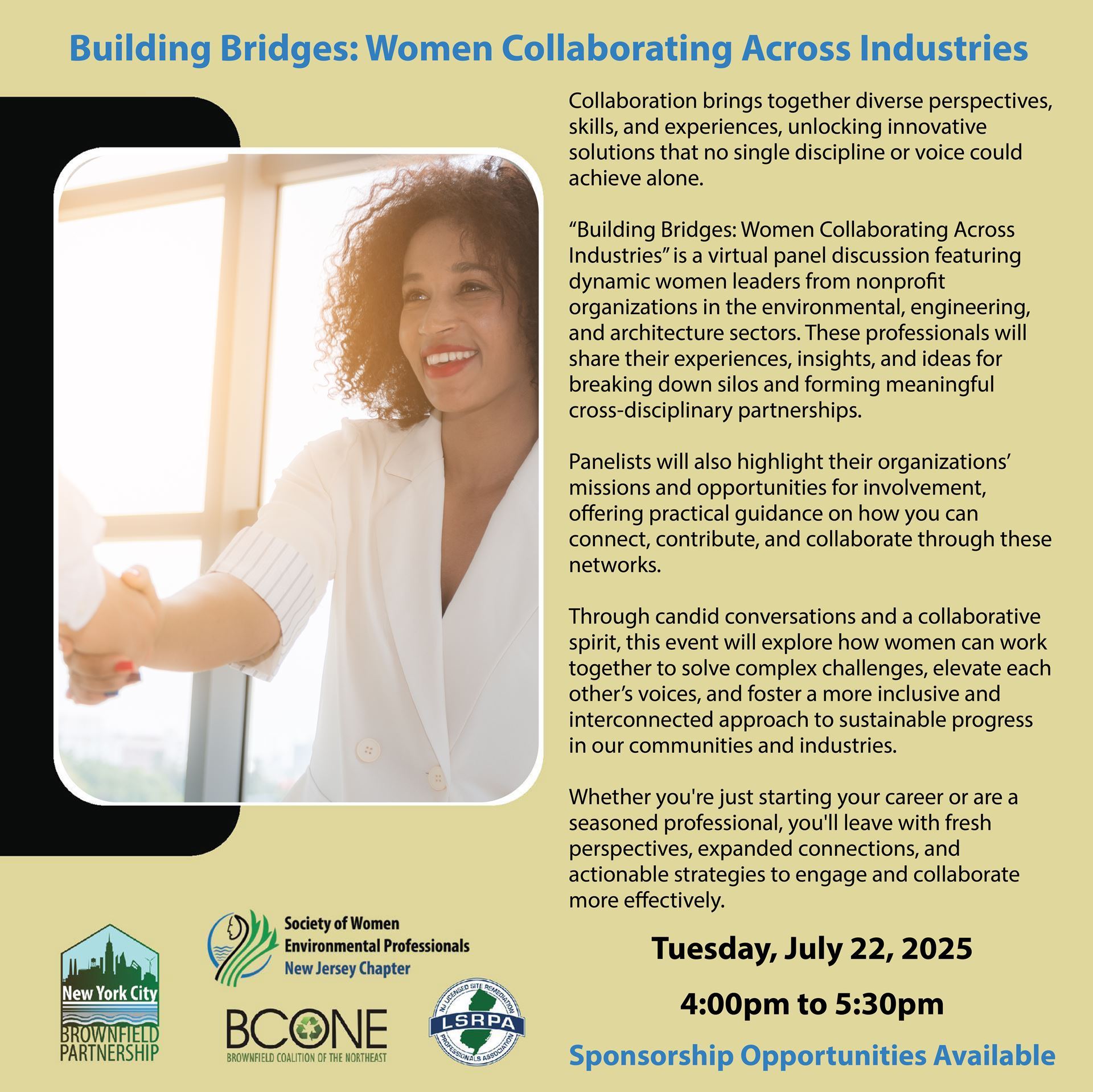 “Building Bridges: Women Collaborating Across Industries” is a virtual panel discussion featuring dynamic women leaders from nonprofit organizations in the environmental, engineering, and architecture sectors. These professionals will share their experiences, insights, and ideas for breaking down silos and forming meaningful cross-disciplinary partnerships.